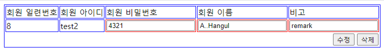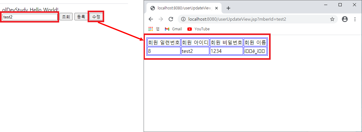등록 때 입력했던 홍길순의 아이디 test2를 넣고 조회했더니 한글이 왕창 깨진 상태로 잘 조회된다.