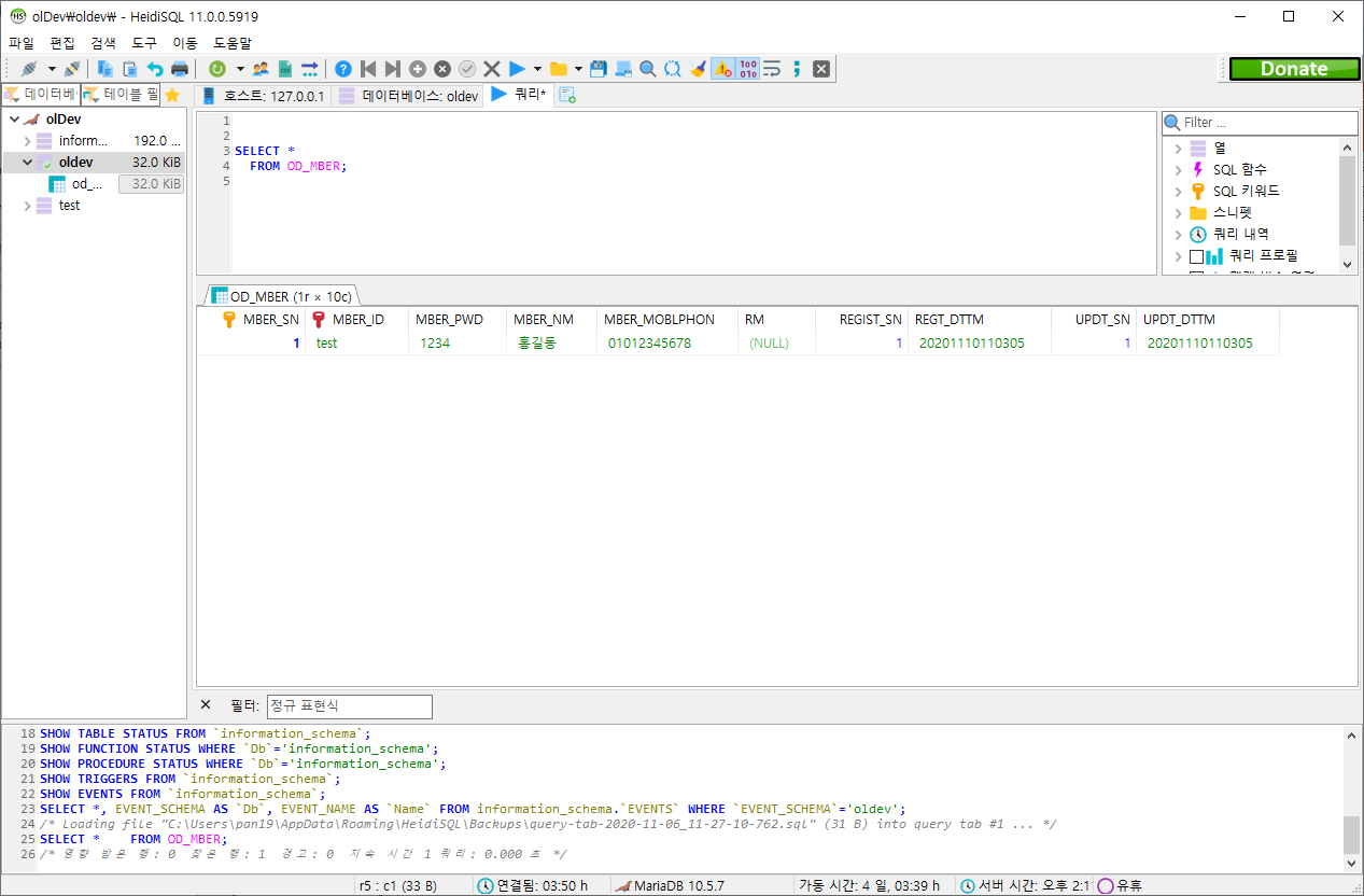 SQL 자체도 기본 문법 그대로이고 데이터도 몇 개 없기 때문에 수정이 되는지 테스트나 해보자.