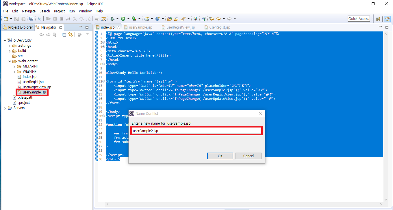 이전에 만들어둔 userSample.jsp를 복사 붙여 넣기하면 파일명을 수정하라고 뜬다.
