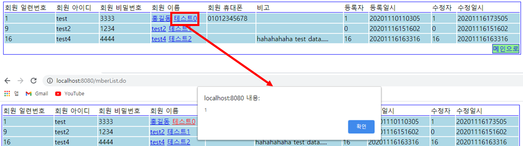 목록에서 jquery로 굳이 하지 않아도 되는 코딩을 해두었는데 그 코딩된 부분을 클릭했을 때 현재 클릭한 MBER_SN을 얼럿으로 알려주고 상세로 이동하게 된다. 앞서 이야기 한대로 jquery 사용에 참고 정도만 하도록 하자.