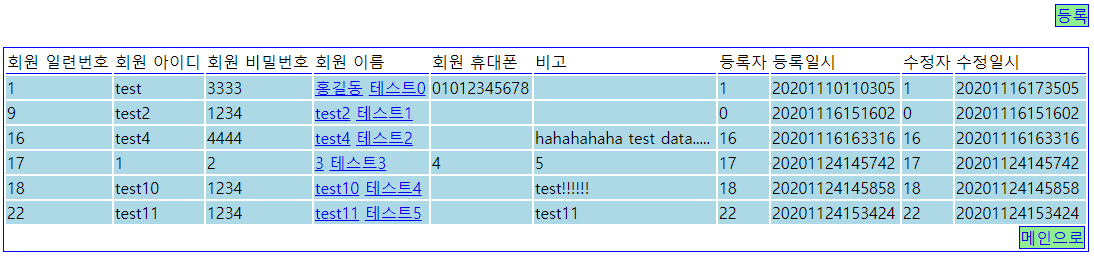 같은 과정의 반복이므로 다른 점만 살펴보면 앞서 했던 저장은 Transaction Test! Message가 출력 됐는데 이번엔 좀 다른 Exception Message 발생했다. 이는 OD_MBER 테이블을 생성할 때 MBER_ID에 제약조건으로 UNIQUE 제약을 주었기 때문에 중복된 아이디인 test11 값이 Insert 될 수 없어 DB가 SQLException을 발생시켰다. 다시 목록으로 가보자.