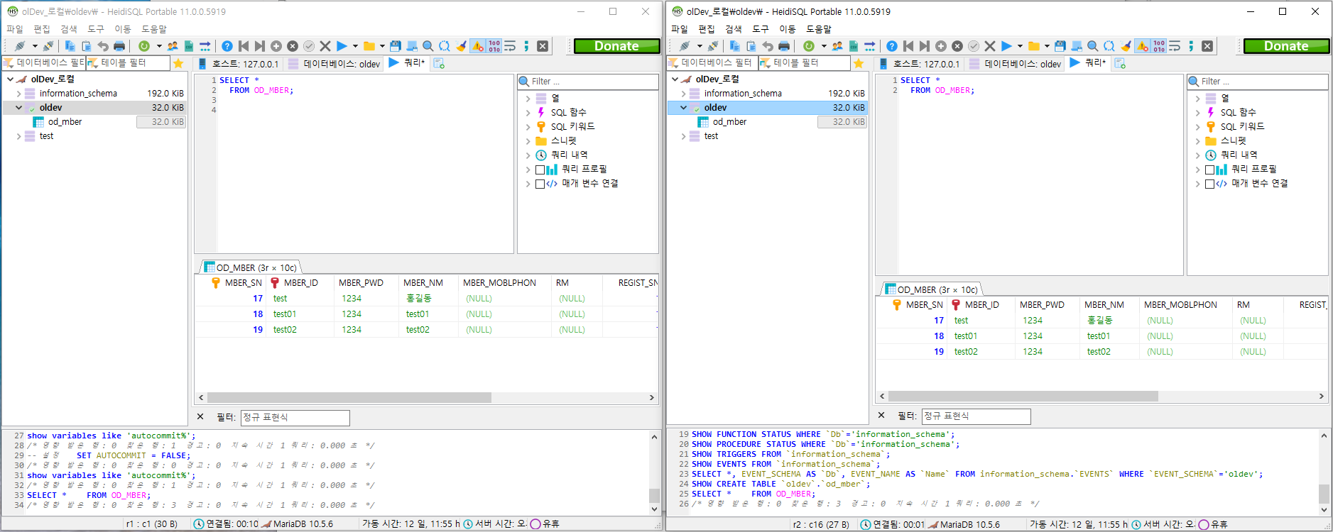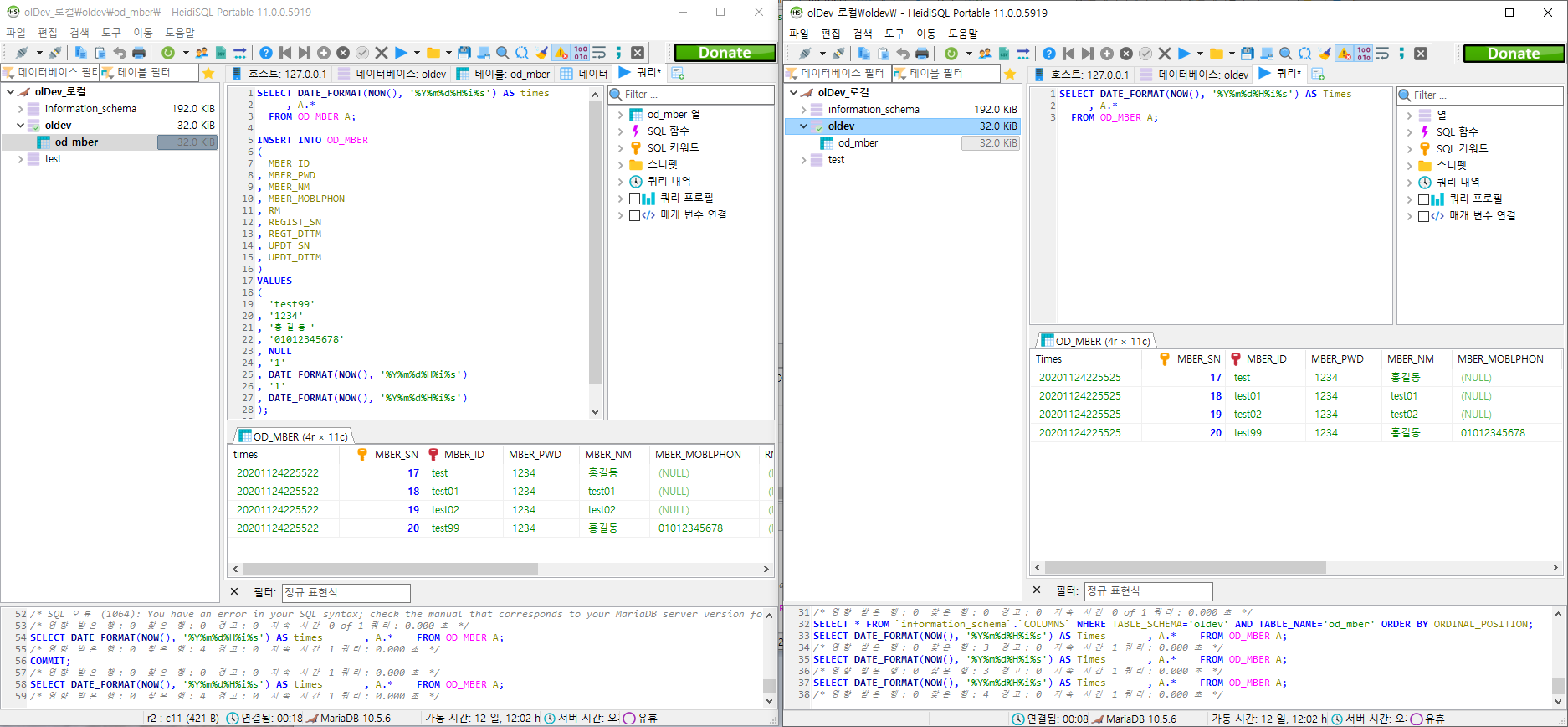 DB툴을 이렇게 두 개를 열었다면 아래 Insert SQL을 복붙 해서 실행해보자.