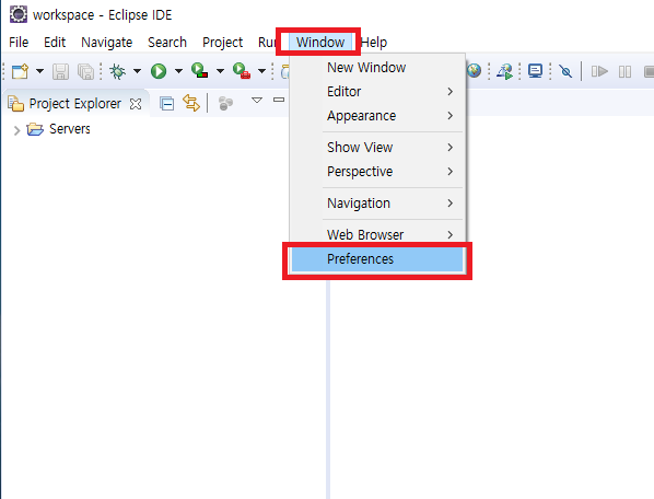 이클립스 최상단의 Windows -> Preferences 를 클릭.좌측 General -> Workspace 클릭하고 기본 MS949로 설정된 캐릭터셋을 UTF-8 선택 (이제 파일들은 UTF-8 encoding 된다.)좌측 메뉴 하단에 Web 메뉴 클릭하고 CSS, HTML, JSP의 캐릭터셋도 변경해주자. (파일내 캐릭터셋이 UTF-8로 설정된다.)