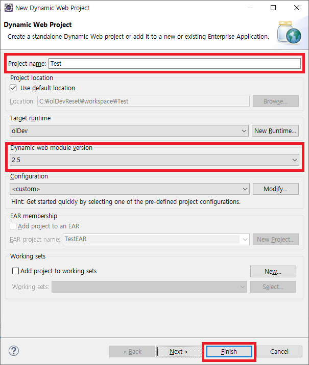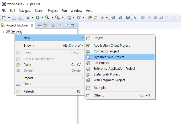 Project Explorer 에서 마우스 우클릭 New -> Dynamic Web Project 클릭Project name 적당히 적어주고, web module 2.5를 선택(3.x 면 web.xml이 안생김) 하고 Finish 클릭생성된 Projeect