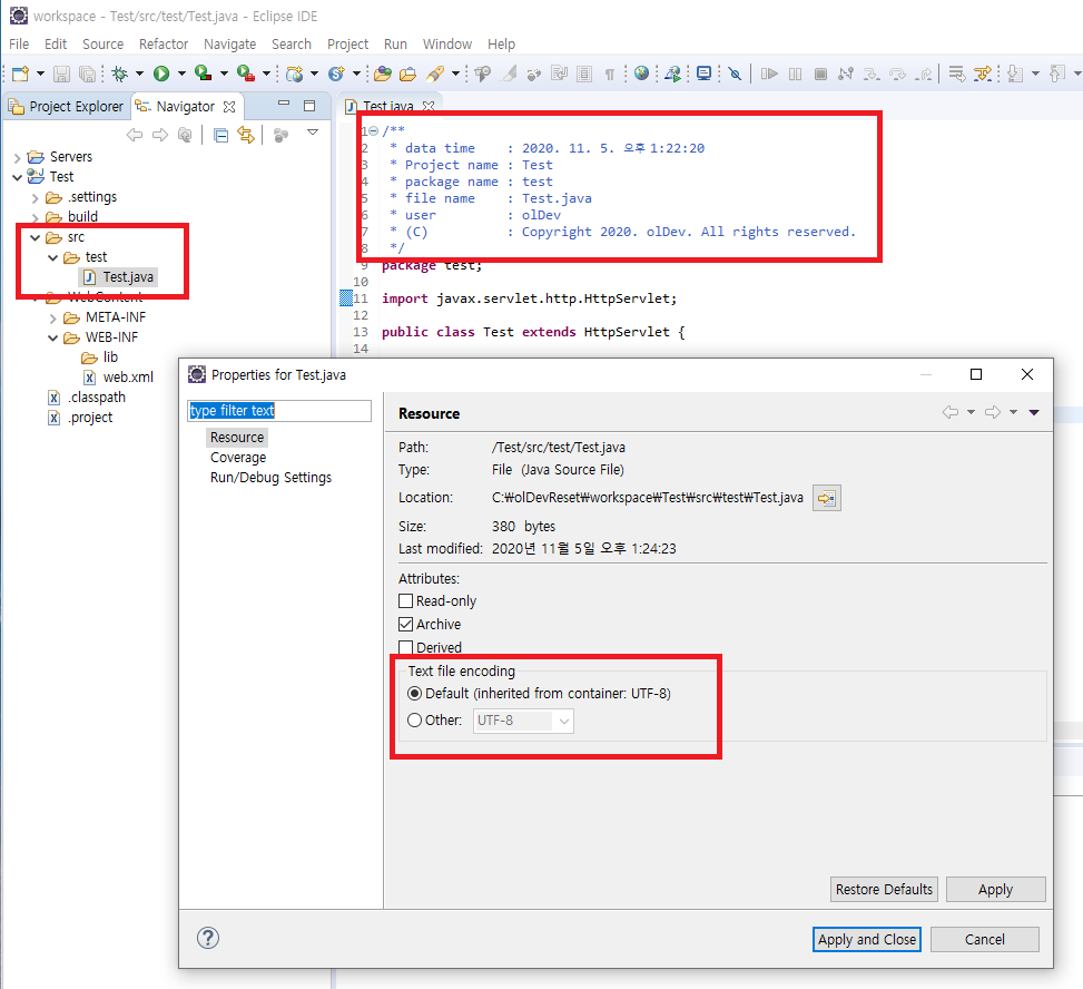 - 이클립스를 실행하고 캐릭터 셋을 바꿔보자. (보통 Server들이 UTF-8 encoding이므로)