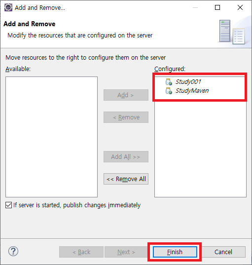 아래와 같은 팝업이 하나 뜨는데 원래는 좌측에 있는 녀석들이다 이미지와 같이 우측으로 옮겨주고 finish 하자.