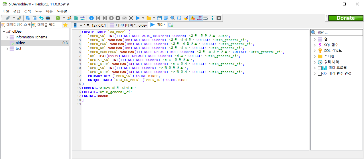 COMMENT='olDev 회원 테이블'