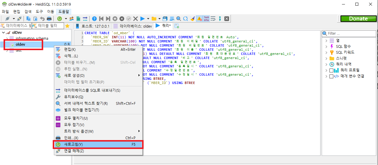 테이블도 하나 생성했으니 데이터를 1건 넣어보자. HeidSql 쿼리 탭에 아래 SQL을 입력하고 실행하자.